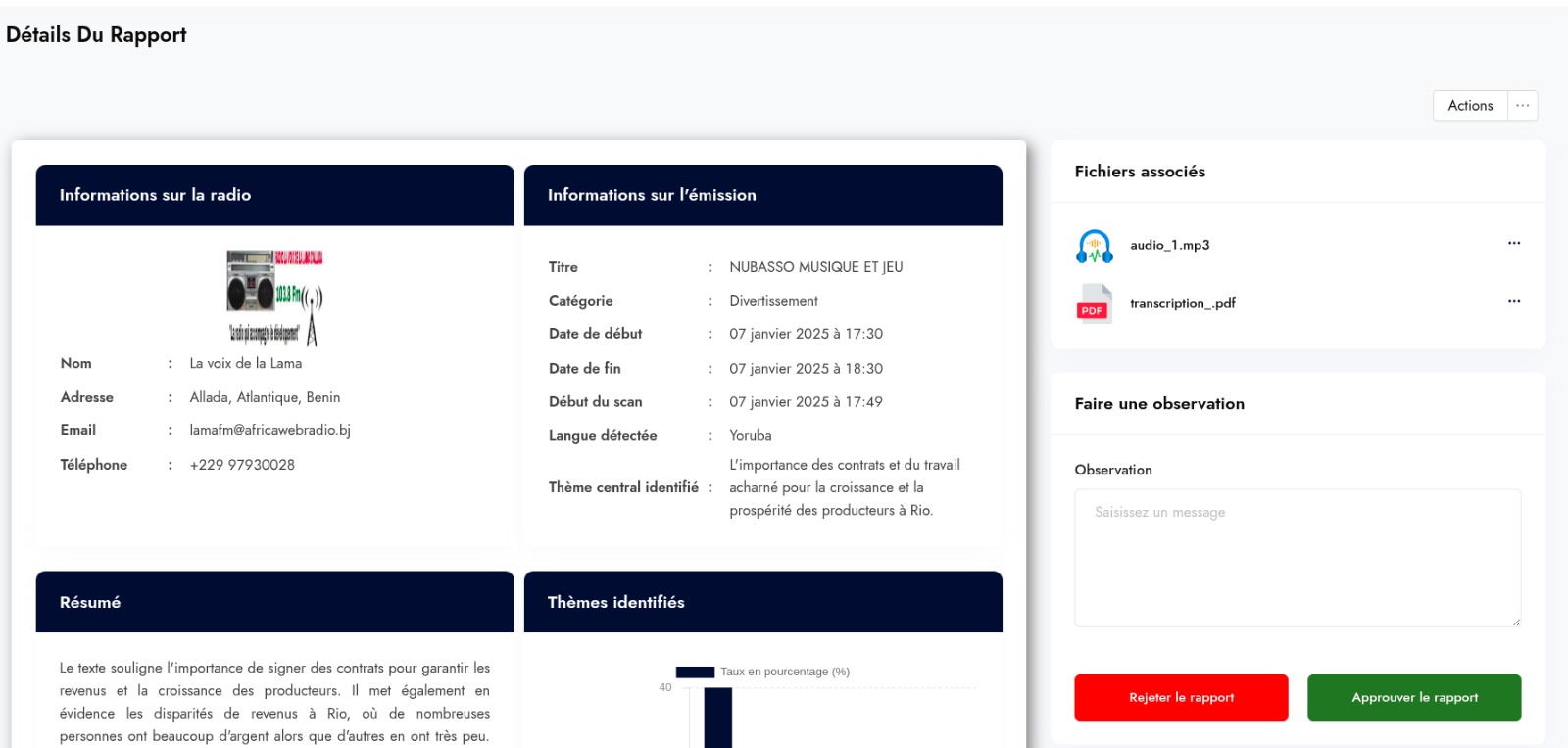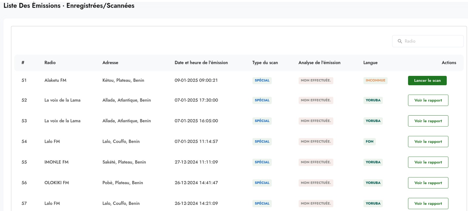 Réaliser pour les langues locales béninoises telque le Baatonum, le Yoruba et le Fongbe, un système de contrôle des diffusions de contenus audio par les médias au Bénin partant d'un système de monitoring existant pour le Francais et l'Anglais.